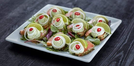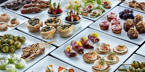 Receptionsmenu, stor – Minimum 20 kuverter – skal bestilles minimum 5 hverdage i forvejen. Den store reception er som en let aftenmenu – kan spises uden bestik. Velegnet til receptioner, åbent hus, fingerfood til festen.
