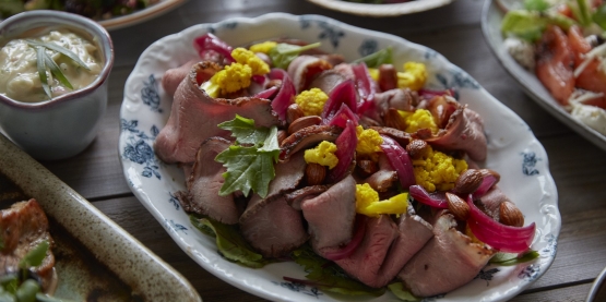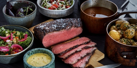 I denne menu har du mulighed for at vælge mellem forskellige forretter og desserter, samt opgradering af kødet til hovedretten. Opgrader til DK mørbrad eller Filet af Black Angus. Se priserne under tilvalg ved bestilling. OBS salaterne i denne menu tilpasses efter vores tapas menuer som skifter efter årstiden.